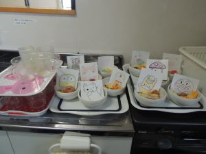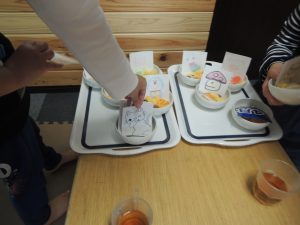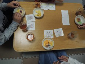 取った絵カードと同じカードが乗っているおやつを取りに行くという、オリジナルなゲーム?