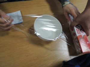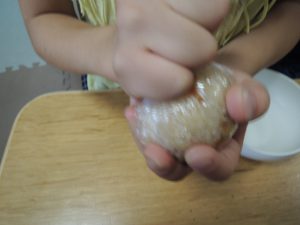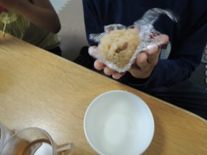 事業所に戻ってから、出来上がった炊き込みご飯を握ります?
