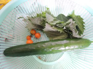 くろーばー農園では、ブルーベリーやミニトマト、キュウリにシソ、
