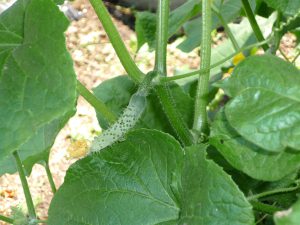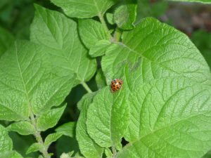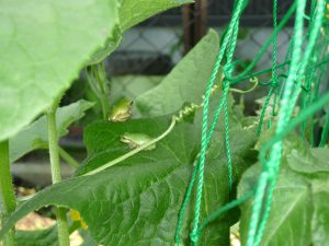 くろーばーの畑の様子です。じゃがいもの葉っぱを独り占めしてモリモリ食べているテントウムシ発見\(◎o◎)/!  日陰になっているキュウリの葉っぱで涼んでいる小さなカエル発見\(◎o◎)/!  キュウリのつるもネットに必死で絡みつこうとしていました。たくさん実をつけ始めています。きゅうりもみ、たくさん食べてくださいね(´~`)モグモグ