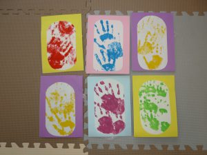 利用者様の手形で大きな時計を作りました。時間は利用者様の大好きなおやつの時間です。