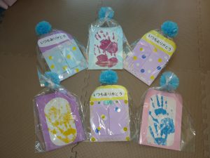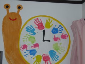 利用者様の手形で大きな時計を作りました。時間は利用者様の大好きなおやつの時間です。