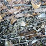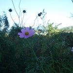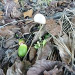 まだ緑のどんぐりも落ちていました。落ち葉の間からきのこも顔を出し、お隣の畑のコスモスも秋の風景を彩っています。