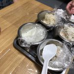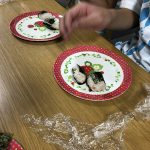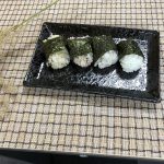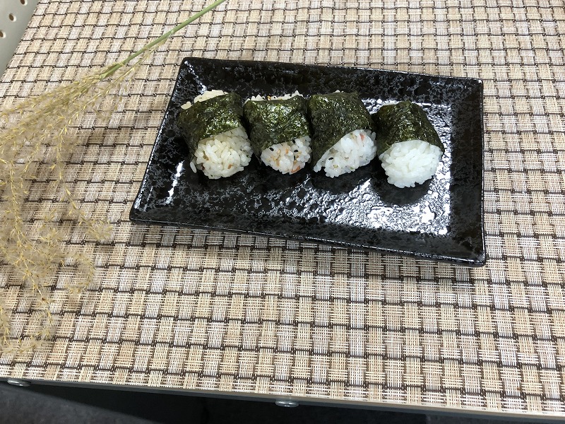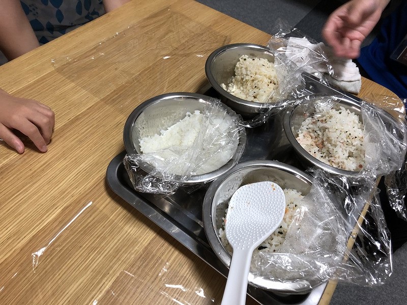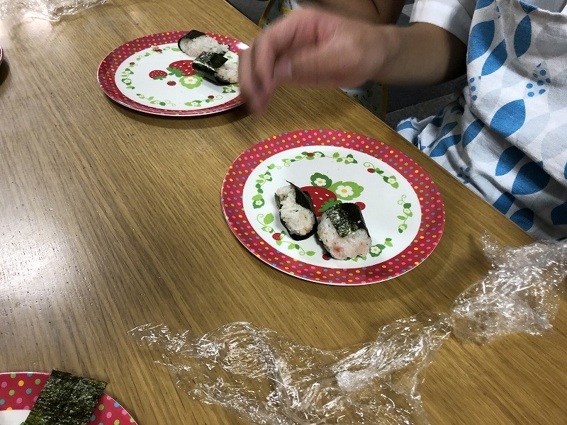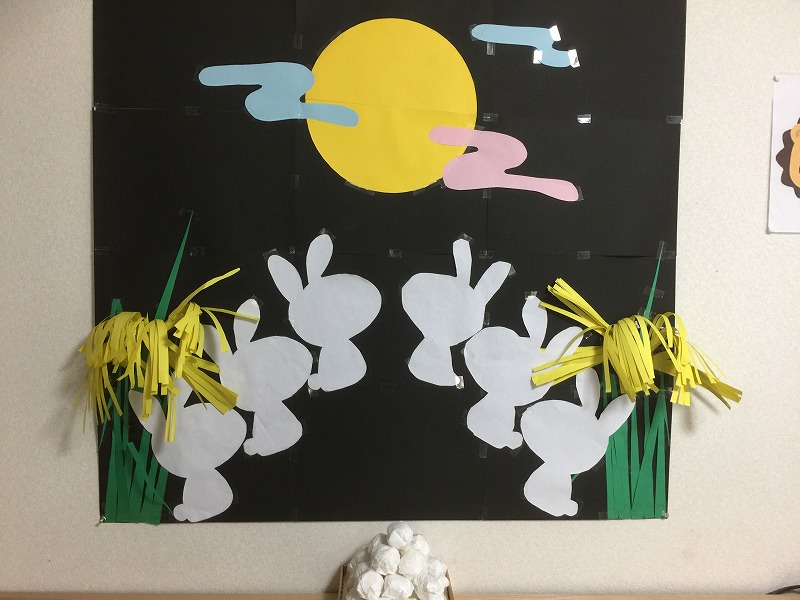 まずは制作の壁画を観ながらお団子に見立てたミニおにぎりを作りました。🎑🍙