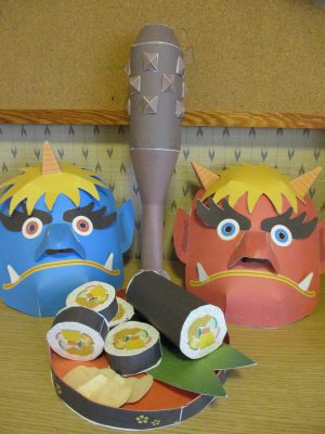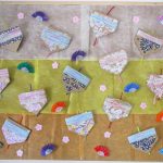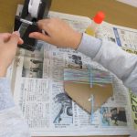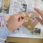 こま型のダンボールに、折り紙のちぎり絵、毛糸を巻いて作りました。和柄の折り紙を使用したので、お正月らしい作品になりました。