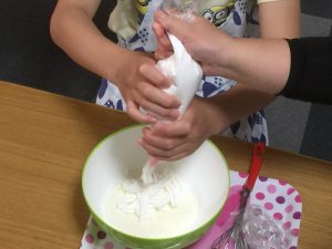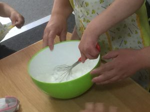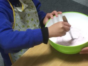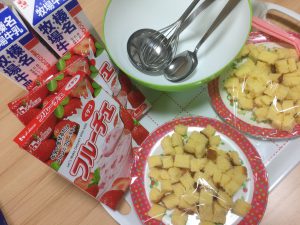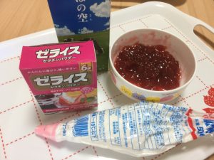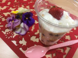 おやつレクレーションでは「イチゴのフルーチェパフェ」と