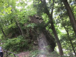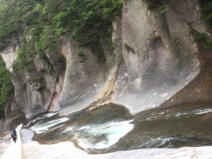 おじさんには、しんどい階段を下りて川沿いに歩いて行くと観えてきました「吹割の滝」