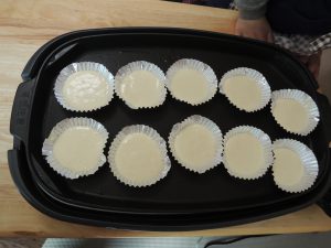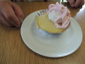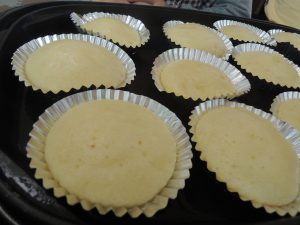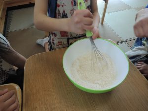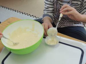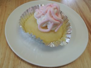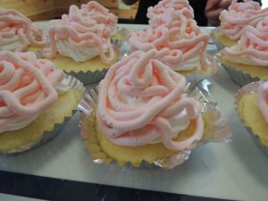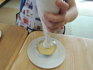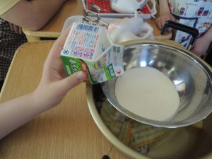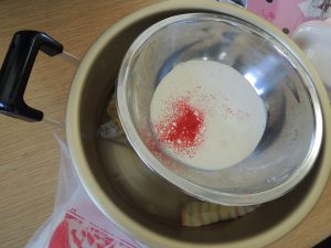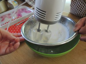 白色のクリームと、ピンク色のクリームを泡立て・・・