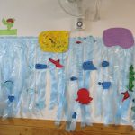 室内でも涼しさを感じられる様にしたい☆ということで、海をイメージした共同製作を行いました🐟船・くらげ・魚・たこ・ヒトデ・わかめ・カモメ。そして、イカ焼きを食べている人(*^。^*) と個性あふれる見ていて楽しい作品になり、暑い毎日を涼しく過ごせました(^^♪