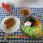 夏休みの恒例になっている夏祭り。朝から担当に分かれ出店の様に作りあげました。チケット交換も、お盆に乗せて運ぶのも、勉強になりました。