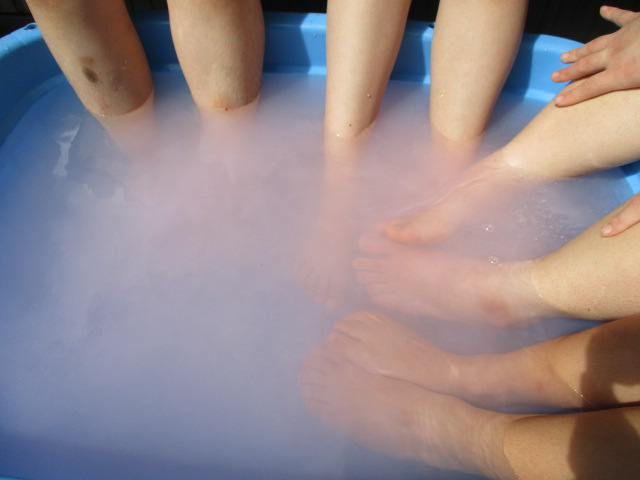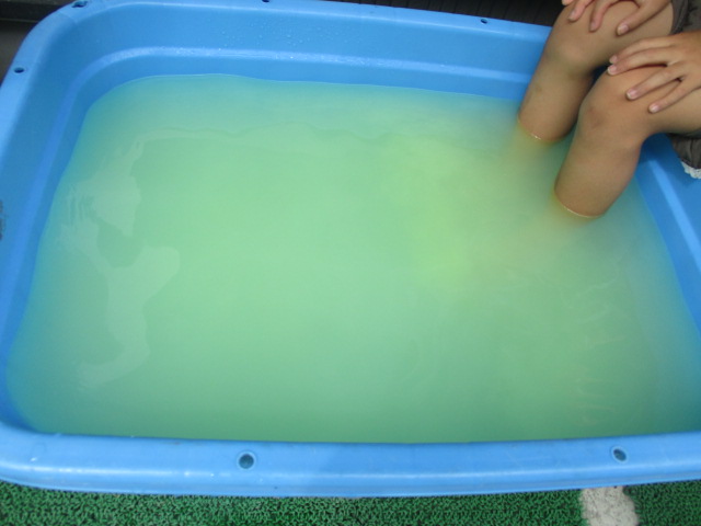 「足湯」ならぬ「足水」👣 深部体温を冷やすにはとても効果的なんだそうです。入浴剤入りで「気持ちいい(*´▽`*)」