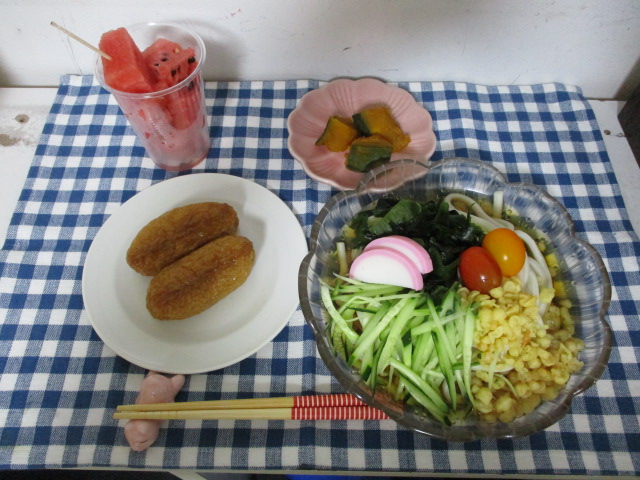 お盆の郷土料理の定番‼ 冷やしたぬきうどんとお稲荷さん。  季節行事を知る事も大切ですね(#^.^#)